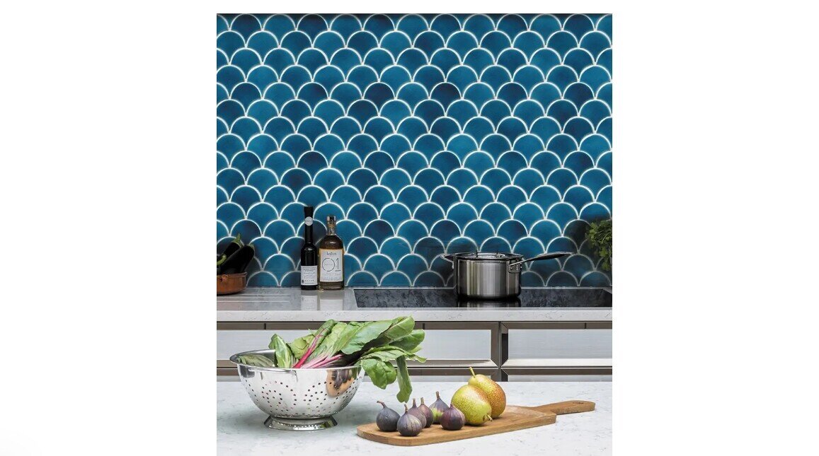 Drifting their way into bathroom and kitchen interiors, these scallop-shaped porcelain mosaic tiles will add drama to any design scheme. The colours of the tiles are inspired by the coast with a bright and vivid palette. The crackle glaze adds a beautiful iridescent finish.