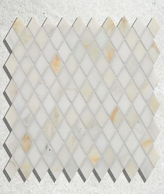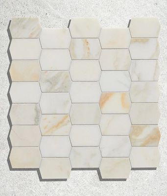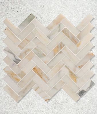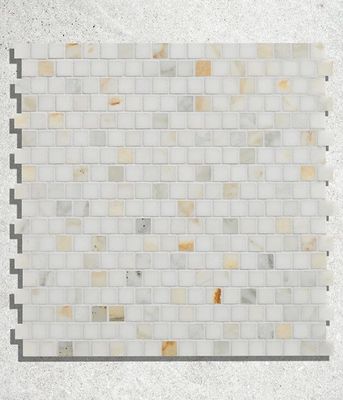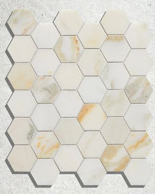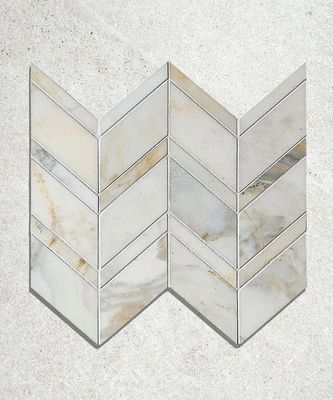 With its antique white background and gold and green highlights, this marble oozes luxury. We love to combine the mosaics, tiles, and the moulding to create a traditional marble bathroom, or use the uniquely shaped mosaics to create elegant drama.