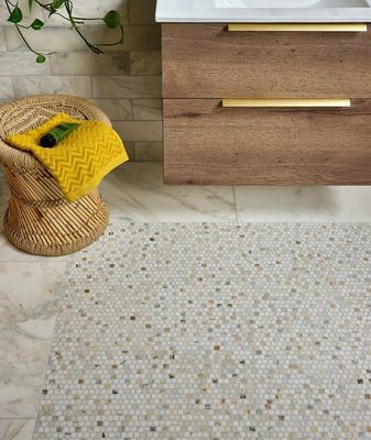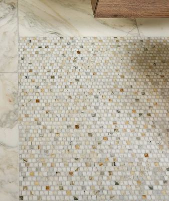 With its antique white background, and gold and green highlights, this marble oozes luxury. We love to combine the mosaics, tiles and the moulding to create a traditional marble bathroom, or using the uniquely shaped mosaics to create elegant drama.