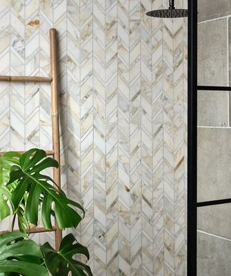 With its antique white background and gold and green highlights, this marble oozes luxury. We love to combine the mosaics, tiles and the moulding to create a traditional marble bathroom, or use the uniquely shaped mosaics to create elegant drama.
