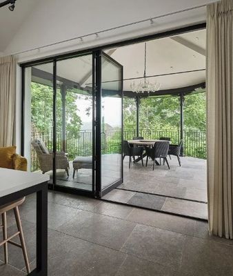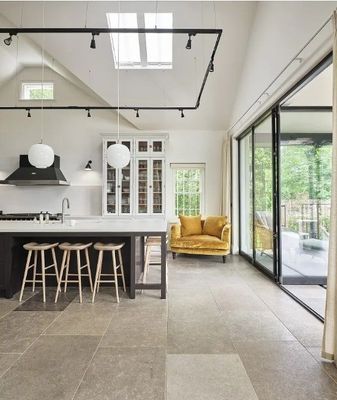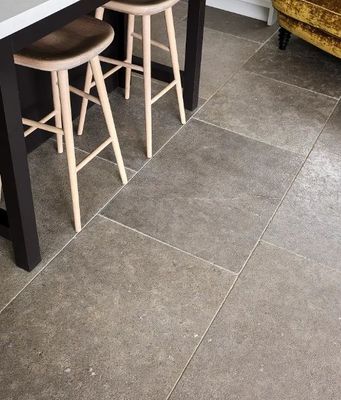 This stone features an organic blend of earthy greys, which gives a beautifully dappled effect across larger areas. The finish gives a slightly grippy, leather-like dappled effect, which blends with the soft, rounded edges and mellows with age.